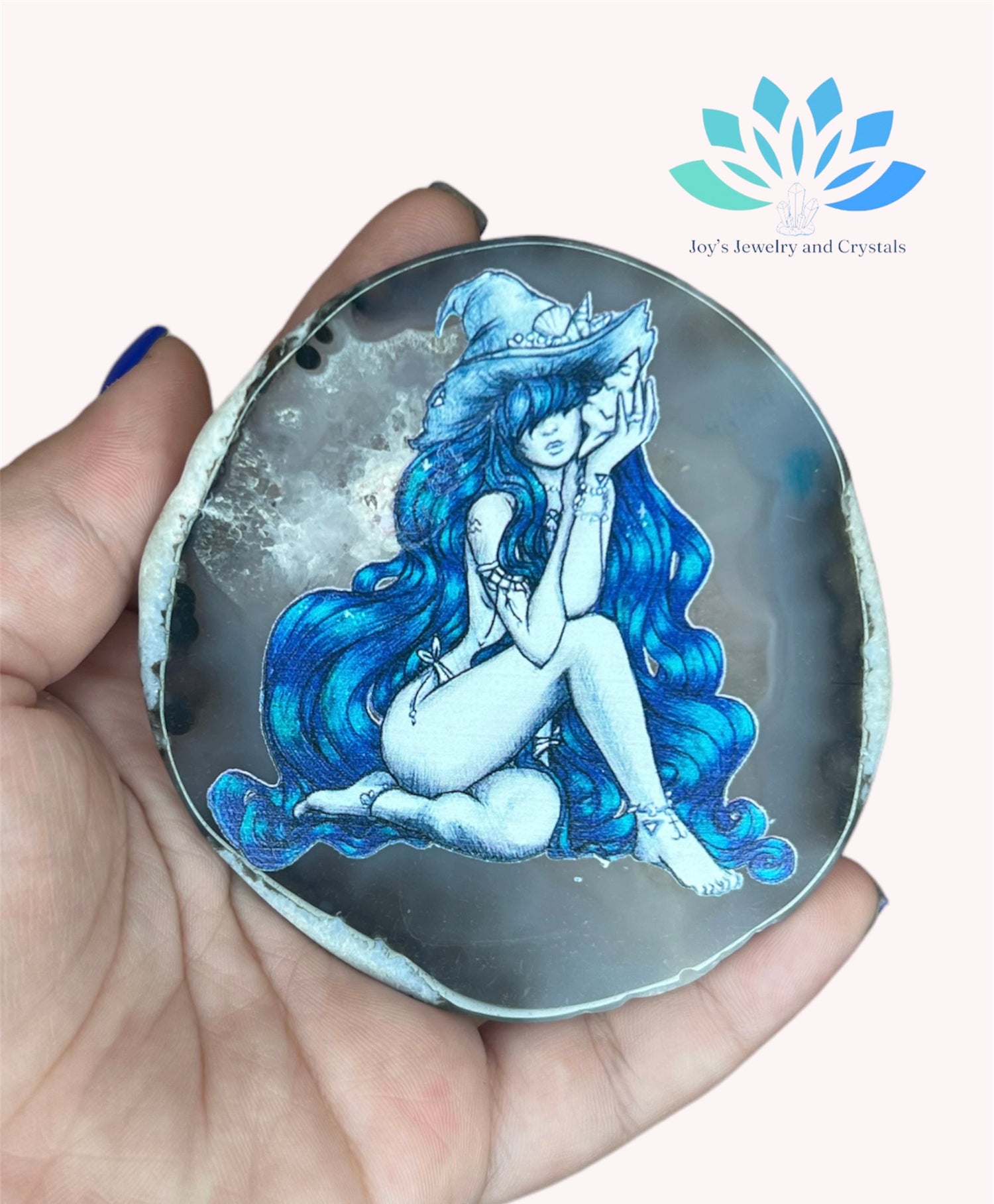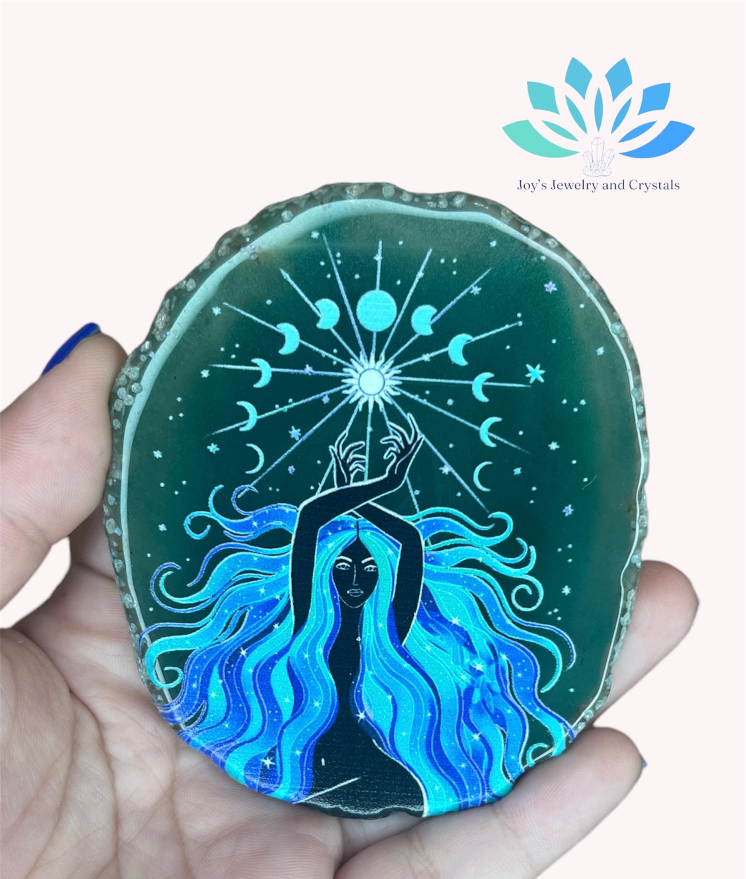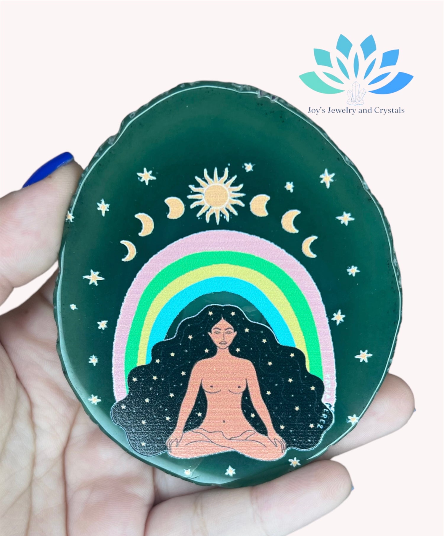 Esta es una hermosa losa de ágata tratada que incluye un soporte acrílico. Perfecto para darle ese aire chic a tu ambiente.