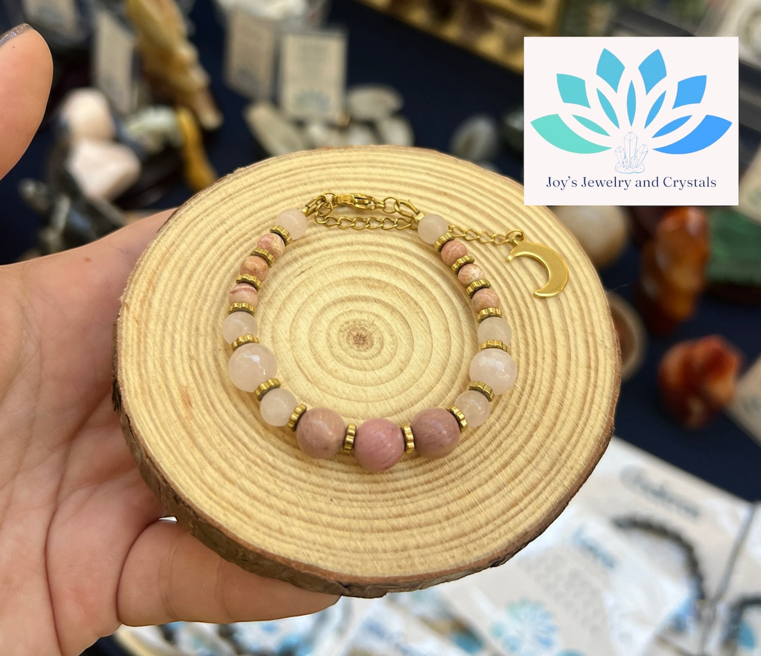 This handmade adjustable love bracelet is a sweet way to show your affection. The extender, in stainless steel, allows for a perfect fit, while the rose quartz, Rhodonite, and Rhodochrosite stones bring love and harmony to the wearer. Spread some love with this unique piece.