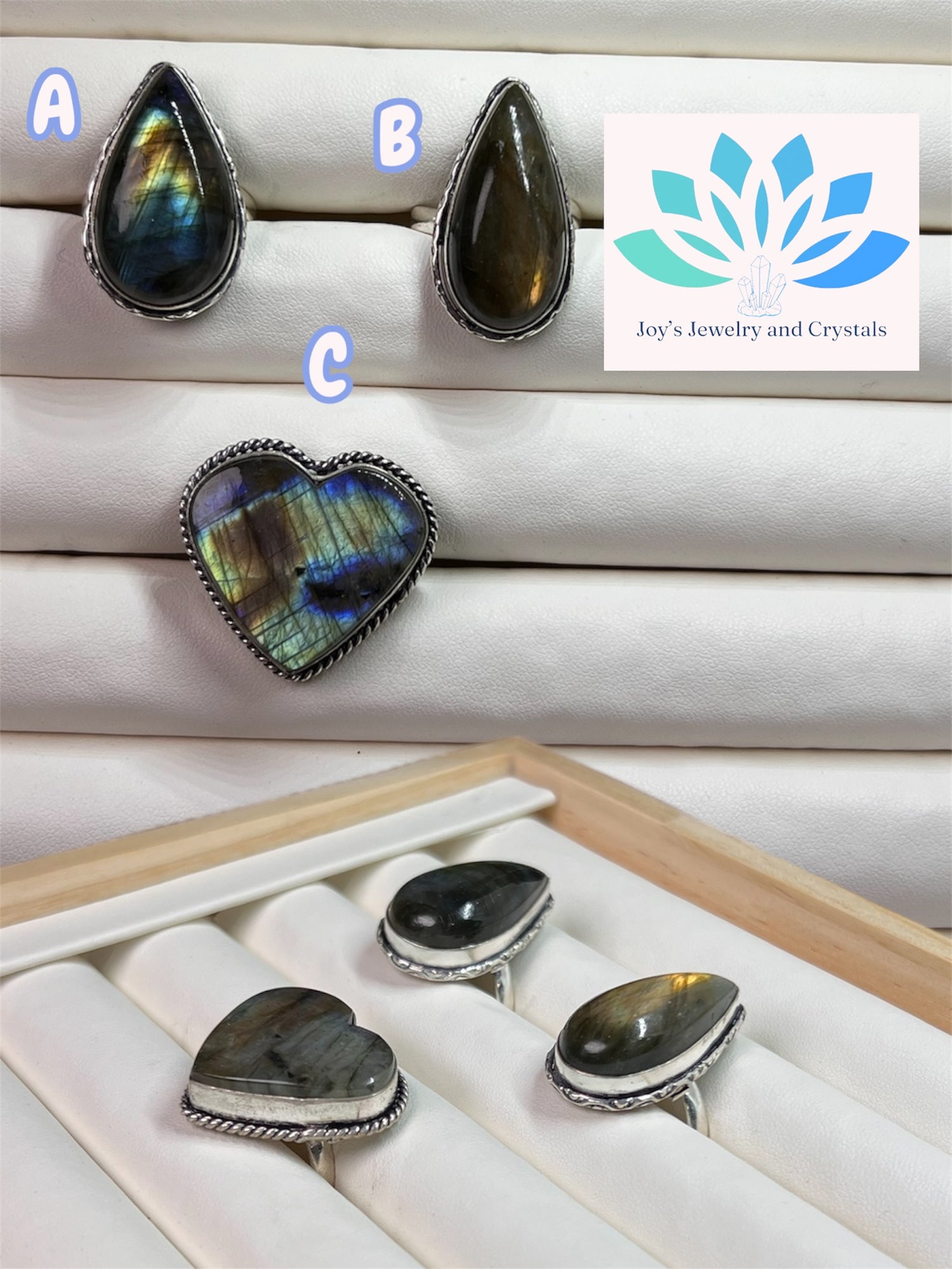 This funky adjustable ring is crafted from 925 silver and features a gorgeous labradorite stone.