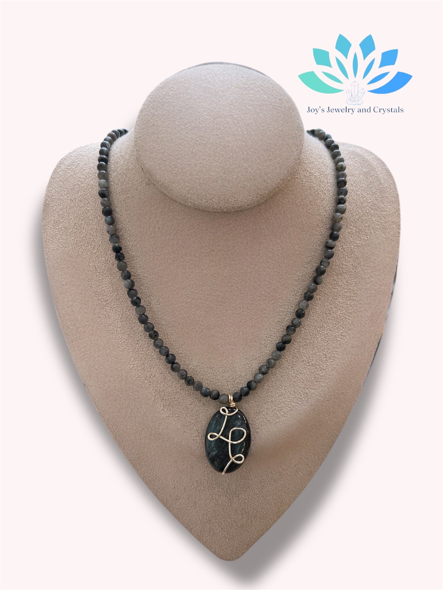 This necklace features a remarkable pairing of Larvakite beads and an Astrophyllite focal point, wired wits non-tarnishing wire. The overall length is 16" with a 2" stainless steel extender included.