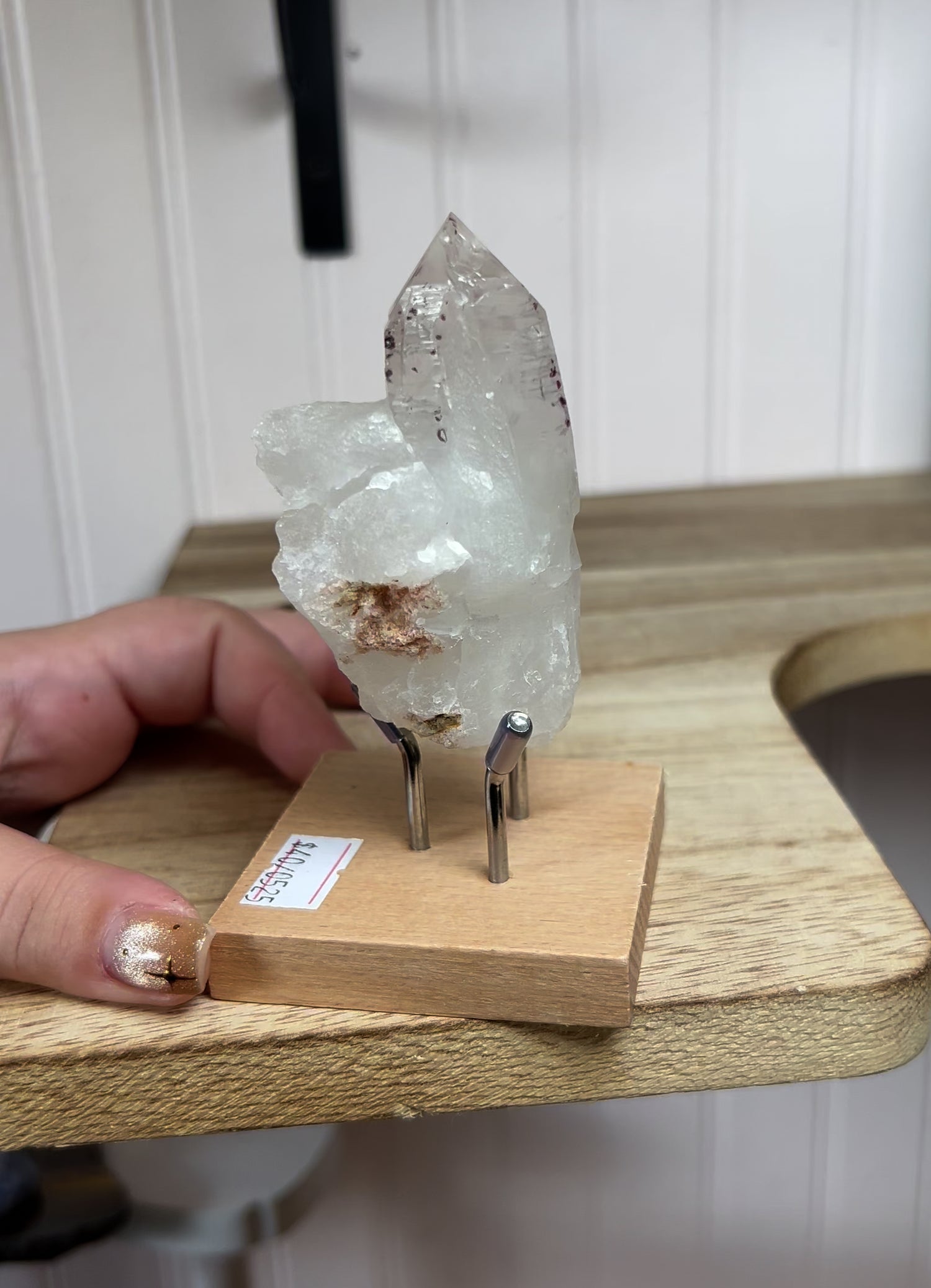 Clear Quartz with Hematite in Stand